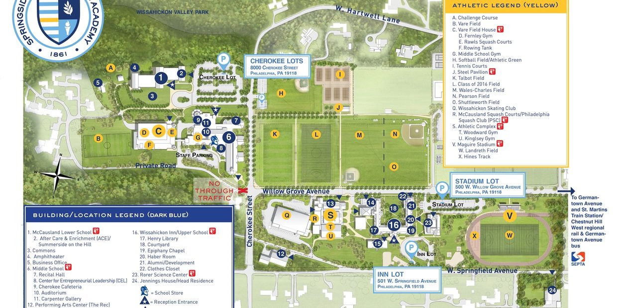 Our robotics competitions are hosted in the Vare Field House (C on the map). Visitors and volunteers can park in the Cherokee Lots located at 8000 Cherokee Street, Philadelphia, PA 19118.